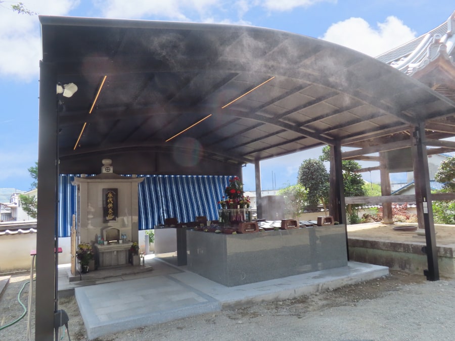 田辺寺に福山市内初のガーデン葬が誕生いたしました。お参りがしやすい全天候型屋根付きのガーデン葬は、雨天時も安心で、夏季には上からミストが降り注ぎます。足元も整備されていて、いつでも快適にお参りいただけます。