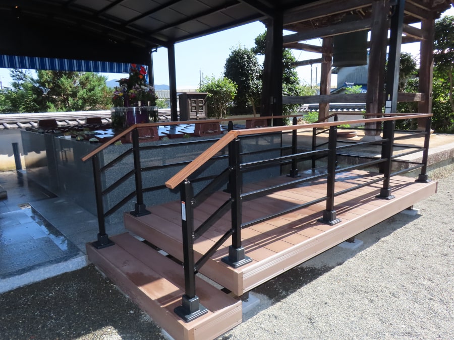 ウッドデッキも併設。お参りの合間に腰を下ろしていただき、ゆったりと語らえる空間としてご利用いただけます。